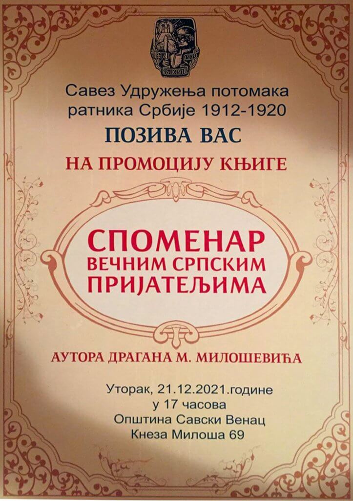 У уторак 21.12.2021.године у општини Савски венац одржана је промоција књиге „Споменар вечним српским пријатељима“ аутора Драгана Милошевића. Организатор промоције ове изузетно вредне књиге је Одбор потомака ратника 1912-1920. године „Војвода Живојин Мишић“ са Савског венца. Књижевно вече је било одлично, садржајно и занимљиво, а првенствено веома поучно, засновано на веродостојним чиљеницама. Публика је била одушевљена говором самог аутора господина Милошевића као и рецезента књиге господина Томислава Кресовића, новинара.
