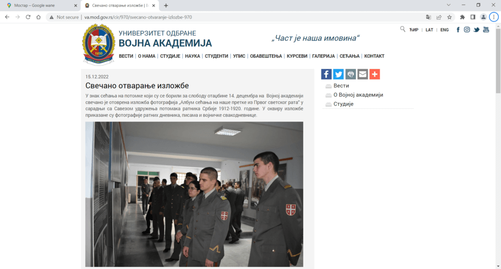 У знак сећања на потомке који су се борили за слободу отаџбине 14. децембра на Војној академији свечано је отоврена изложба фотографија „Албум сећања на наше претке из Првог светског рата“ у сарадњи са Савезом удружења потомака ратника Србије 1912-1920. године. У оквиру изложбе приказане су фотографије ратних дневника, писама и војничке свакодневнице. Више о отвореној изложби погледајте на сајту Војне академије >>>>