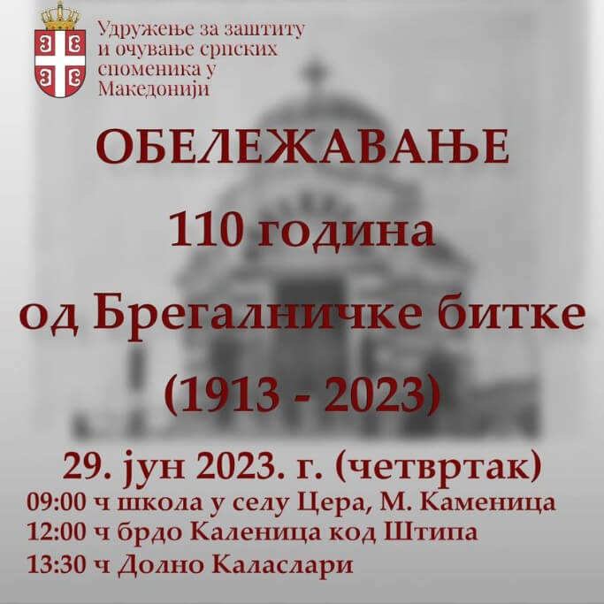 Делегација Републичког одбора Савеза потомака ратника Србије 1912-1920. присуствоваће церемонији обележавања 110 година од велике Брегалничке битке која је започела мучким ноћним нападом бугарске војске 17. јуна 1913. године по старом календару а 29. по новом, и завршена 9. јула по новом календару. Тај као и увек мучки напад на Србију и Грчку неславно и катастрофално је завршио по Бугарску. Бугарска војска је на Брегалници доживела тежак пораз од српске војске коју су предводили престолонаследник Александар први Карађорђевић и војводе и генерали Путник, Бојовић и Мишић.