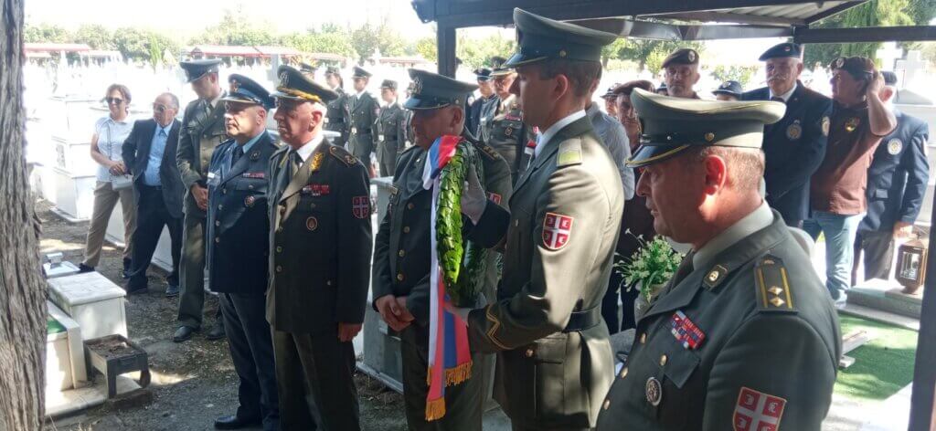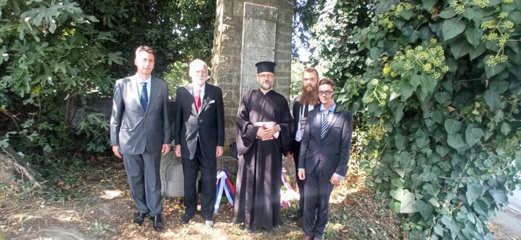 Председник Савеза потомака ратника Србије 1912-1920. Иван Стратимировић и председник ОО Савеза у Грделици Стефан Стојановић са војним свештеником и делегатима Друштва за неговање традиција ослободилачких ратова Србије 1912-1918. код споменика српским ратницима на гробљу у Алмопији