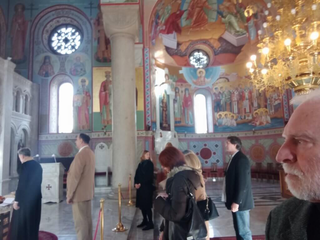 Школска Слава Свети Сава Прве београдске гимназије обележена је из безбедносних разлога у цркви Светог Александра Невског. На слици директор Александар Андрејић, професори, члан већа општине Стари град Недељко Јовановић и Иван Стратимировић у име Савеза потомака